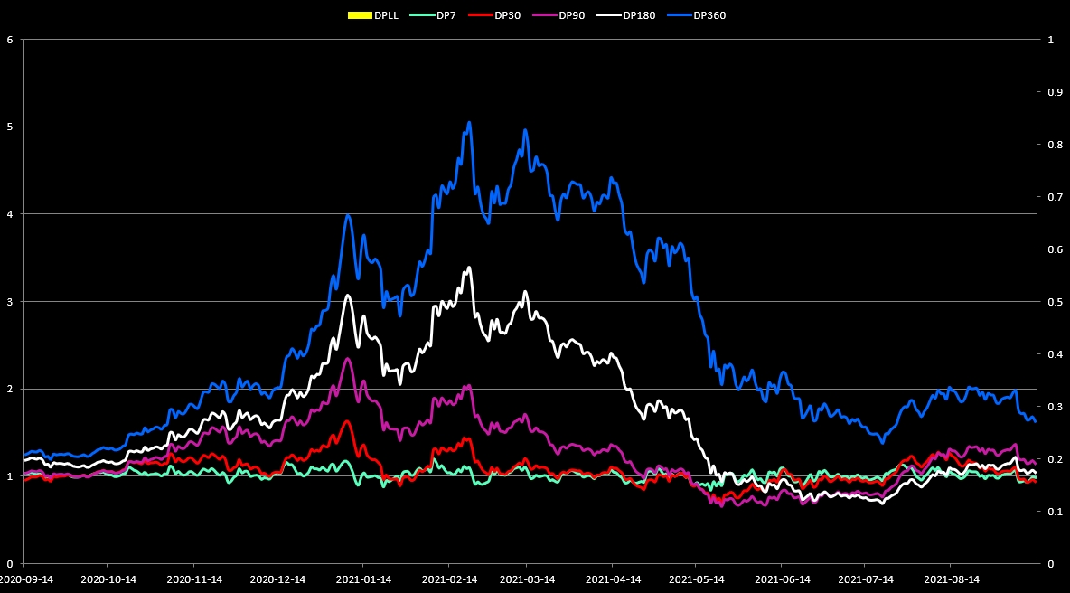이격도 = 현재 값 / 이동평균 값, 이 수식은 현재의 수치가 특정 구간에서 어느위치에 있는지 보여줍니다. 이격도가 1이면 해당 구간별 가장 일반적인 값을 나타내고 1보다 크면 고평가, 1보다 작으면 저평가를 나타냅니다. 장기 이평선은 매우 고평가를 보여주고 있습니다. 여기서 각 이격도별 편차를 차트로 나타내면 아래와 같습니다.