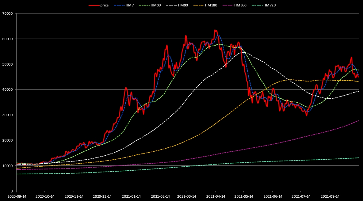 이평선에 아주 큰 의미를 부여하지는 않습니다만, 특정기간별 방향성을 파악하기에는 이평선만큼 좋은 지표를 찾기 힘듭니다. 해당 이평선은 시세 급등락을 최대한 보정하기 위해 조화평균으로 산정하였습니다. 평균은 산술평균, 기하평균, 조화평균등이 있습니다. 이중에서 가장 작은 값을 보이는 것이 바로 조화평균 입니다. 코인의 경우 엄청난 변동성을 동반하는 만큼 조화평균을 적용하여 최대한 객관적인 추세를 보기 위해 노력 하였습니다.