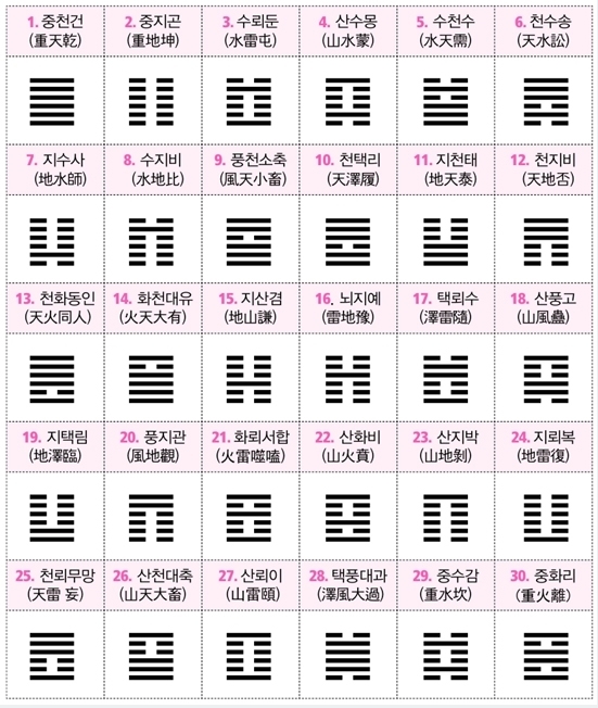 30) 이위화 (離爲火) 위도 불[火]이고, 아래도 불[火]이다. 불 두 개가 겹쳐있으니 화(火)를 괘 이름으로 하였다. 불 두 개는 태양을 상징하며, 정열과 왕성한 의욕을 뜻한다.