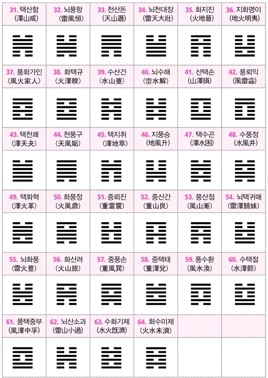 31) 택산함 (澤山咸) 위는 못[澤]이고, 아래는 산[山]이다. 함(咸)은 감(感)과 같은 뜻으로 ‘느낌이 좋다’는 의미다. 젊은 여자를 상징하는 태(兌)괘 아래 젊은 남자를 상징하는 간(艮)괘가 있다. 남녀간의 순수한 사랑을 상징하는 감상적인 의미의 함(咸)이다.