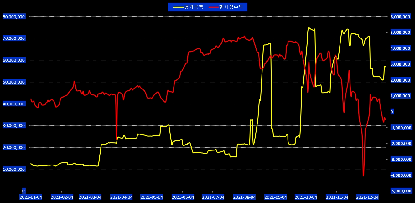 올해 2021년 부분만 별도로 추려서 차트로 정리한 자료입니다. 로직의 특성상 하락할때 투자금이 크게 들어가기 때문에 올해 초 보다는 투자금이 크게 늘었습니다. 하지만 수익은 다 반납하고 말았습니다. 투자금이 크게 증가했기 때문에 계좌의 변동성은 과거보다는 더욱 커질 것입니다. 11월과 12월 하락장이 었지만 어찌되었던 원칙대로 손절하고, 추가매수를 지속적으로 실시하였습니다. 덕분에 손실은 커지고 투자금은 늘어나게 되었네요. 결과적으로 아쉽게 되었지만 원칙을 무너뜨릴 생각은 없습니다.