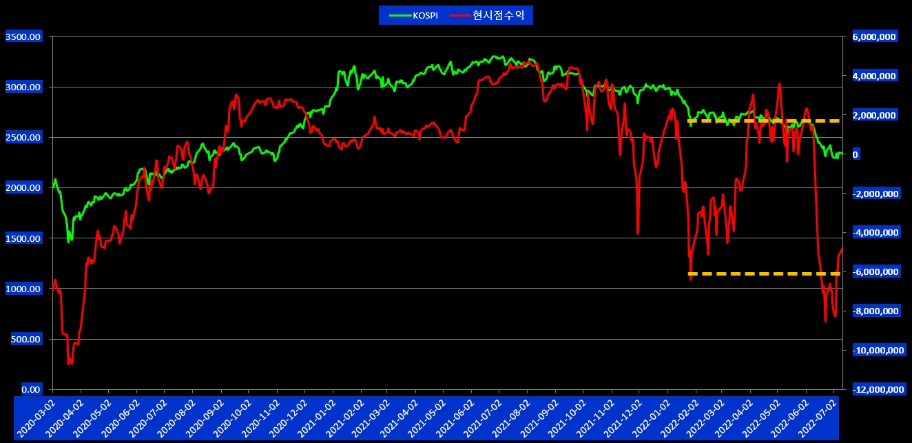 노란색 실선 부분을 비교해보면 지수는 회복하지 못하였지만, 손실을 만회한 폭은 지수의 상승폭을 넘어서 있습니다. 비교적 하락방어가 나쁘지 않았고, 저점에서 상승률이 지수 상승률을 초과했다는 것을 뜻합니다. 기계적인 손절이 하락장에서 손실폭을 억제하였고, 또한 기계적인 매수가 지수의 상승보다 높은 수익을 보였습니다.