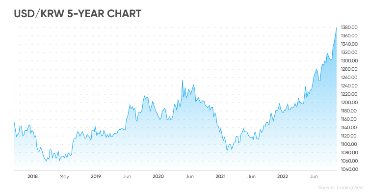 세계 경제가 갈수록 침체 조짐을 보이는 상황에서 주요 에너지 수입국이자, 반도체, 산업 기계, 자동차 등의 수출국으로 역풍에 직면해 있다. 원달러 환율은 1,083원 근처에서 거래되었던 2020년 11월 이후 더 높은 상승 추세를 보이고 있으며 2022년에는 1,195원에서 시작했다. 러시아의 우크라이나 침공과 연준의 금리 인상에 따라 달러가 강세를 보임에 따라 3월에는 달러당 1,200원 이상으로 상승했다.