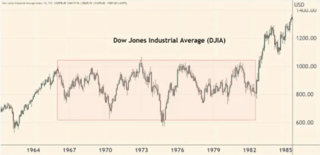 현재 가장 우려되는 사항은 1966년과 1982년 사이의 아주 길고 지루한 횡보기간, 즉 1970년대의 주식시장과 유사한 흐름을 보일수도 있다는 것이다. 주식시장은 상승과 하락을 반복했지만 결국 16년동안 제자리걸음을 유지했다.