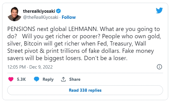 그는 또한 비트코인 외에 금, 은과 같은 실물 귀금속에 대한 투자를 강조했고, 자신은 트레이더가 아닌 비트코인의 장기 투자자이며, 만약 비트코인이 더 떨어진다면 긴장하기 보다는 흥분할 것이라고 언급했다. 기요사키는 미국 연금의 위기가 다음번 리먼 사태일 수 있다고 경고했다. 최근 영국의 연기금이 거의 붕괴할 뻔했고 기요사키는 미국에서도 이와 비슷한 상황이 벌어질 수 있다고 경고 했다.