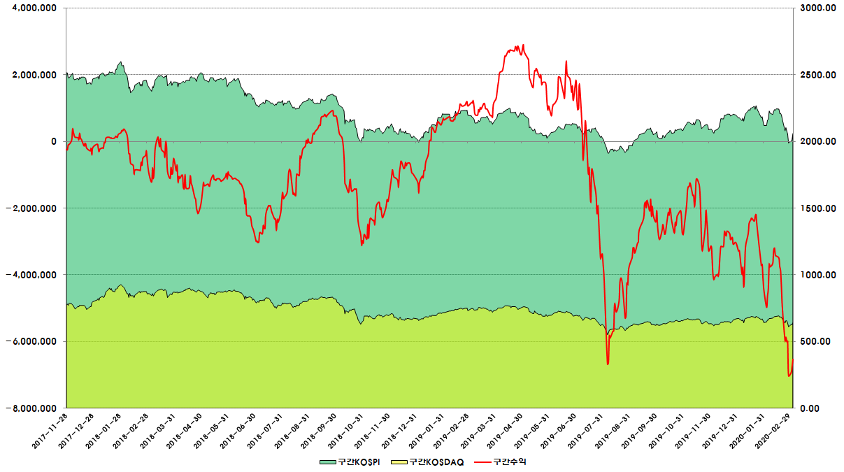 이는 확률밀도 함수에 근거하여 저점을 포착하는 전략이었다. 3.56년을 운용한 전략으로 지수가 상승할때는 어느정도 따라가는 모습을 보였지만, 하락방어를 전혀 하지 못하고, 손실이 급격하게 커지고 말았다. 하락장에 종목이 더 많이 포착되면서 하락시에 투자금이 늘어나고, 상승시에는 종목이 나오지 않는 상황이 종종 발생했다. 특히나 안좋았던 점은, 무려 2년 넘게 보유했던 종목도 있었기 때문에 종목 회전이 너무나도 느렸다. 손절라인에 닿지도 않고, 그렇다고 익절가에 도달하지도 않는 애매모호한 종목을 끌어안고 있는 상황이 지속되었다. 결국에는 이 전략도 폐기하고 말핬다.