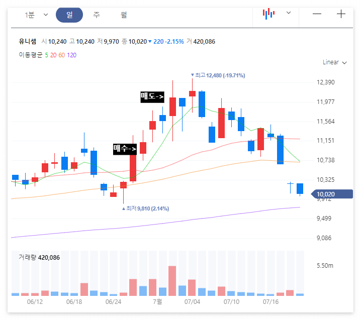 유니셈 이란 투자종목에 대한 결과 입니다. 기본적으로 투자전략은 차트를 기반으로 하고 있습니다. 또한 추세추종전략이 바탕입니다. 이번 종목은 유니셈 입니다. 수익으로 마무리 하였습니다. 수익종목 뿐만이 아니라 손실된 종목도 공개할 예정입니다. 아직 순서가 되지 않아서 차근차근 올릴 계획으로 손실에 대한 종목또 꽤 많습니다.