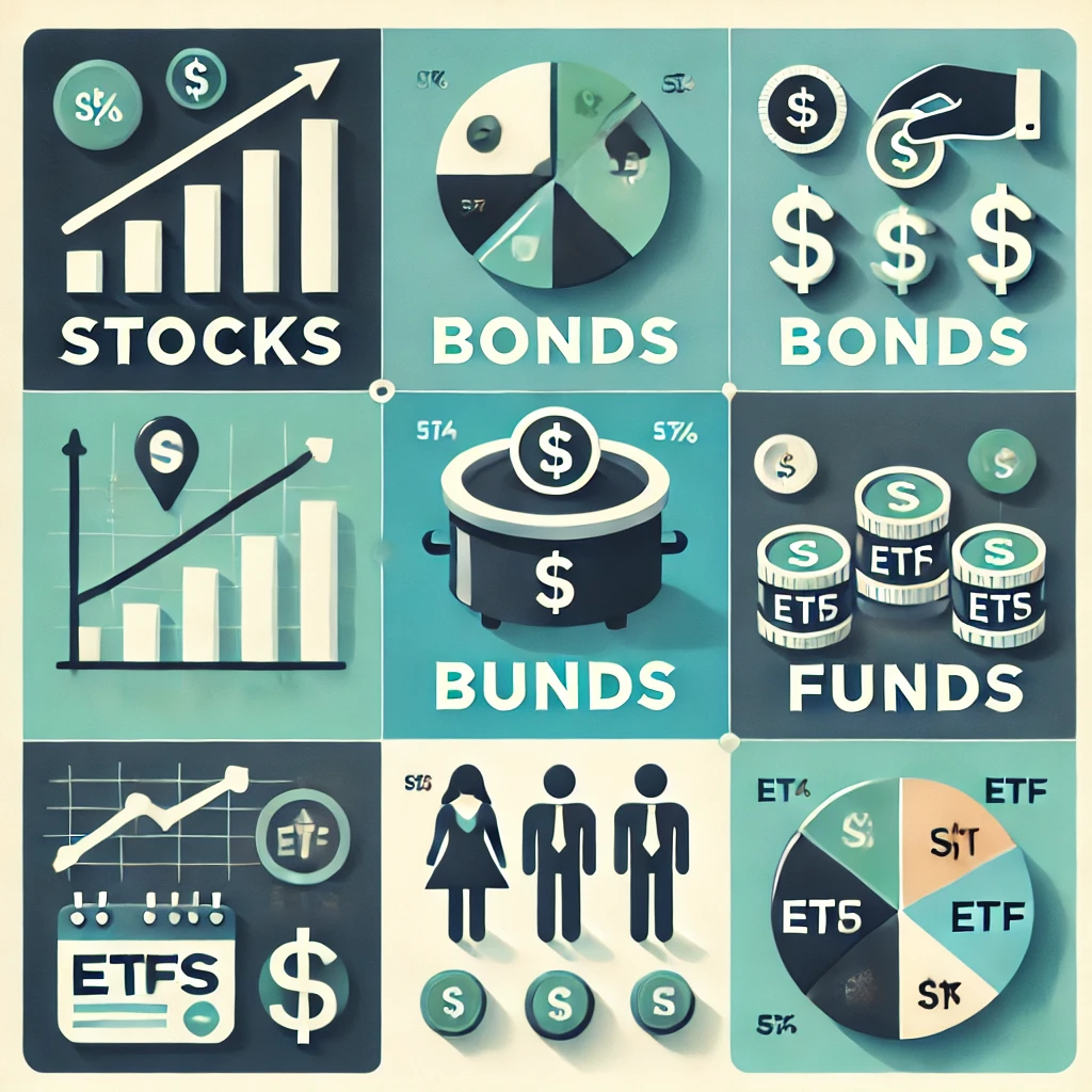 - 주식, 채권, 펀드, ETF는 각각 다른 투자 방법으로, 개인 투자자들이 다양한 목적과 리스크 선호에 맞춰 선택할 수 있는 투자 수단입니다. 각 투자 수단의 특징, 장단점, 리스크 등을 구체적으로 설명하겠습니다.